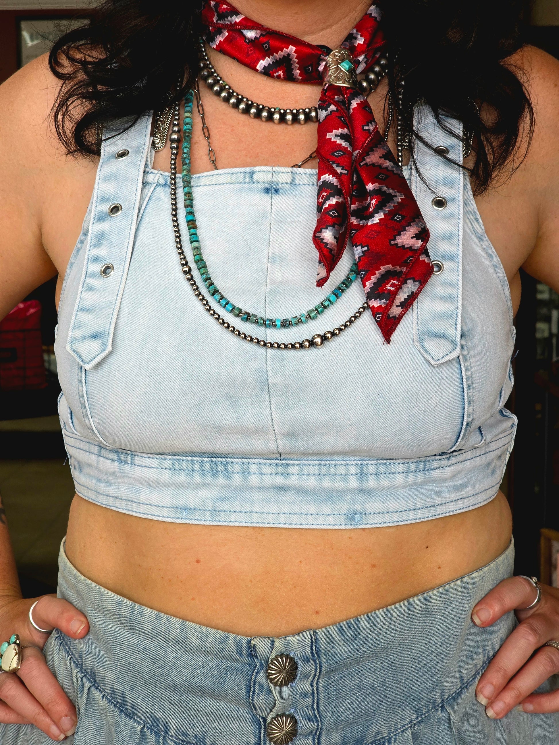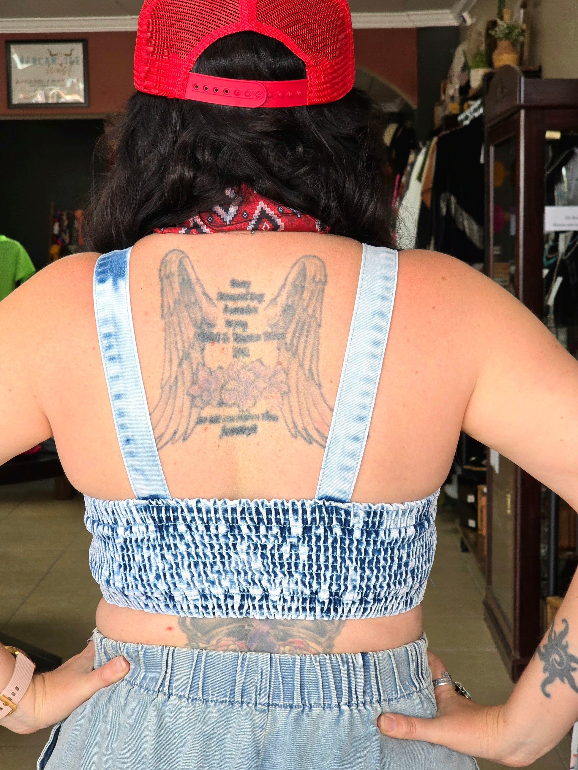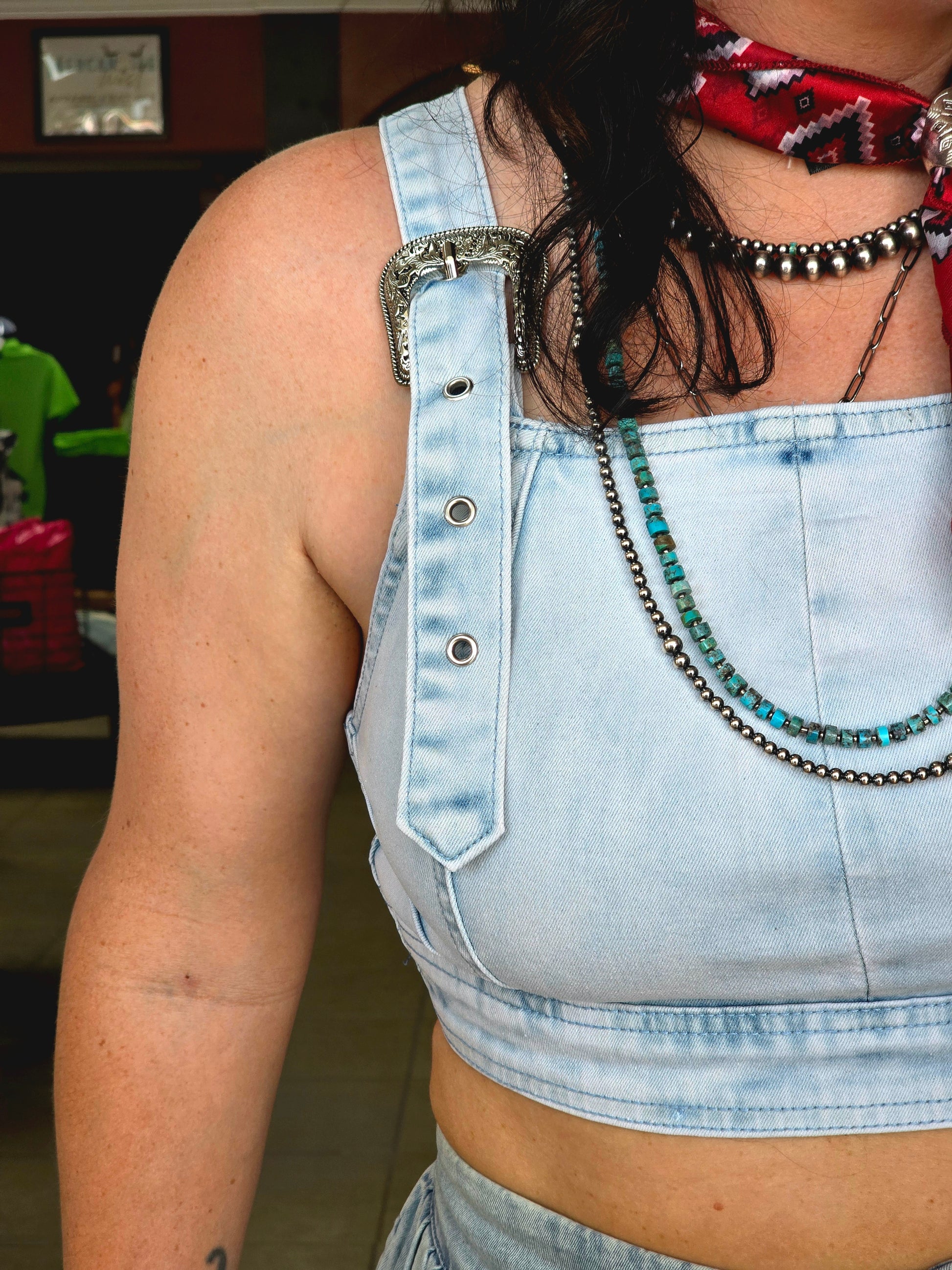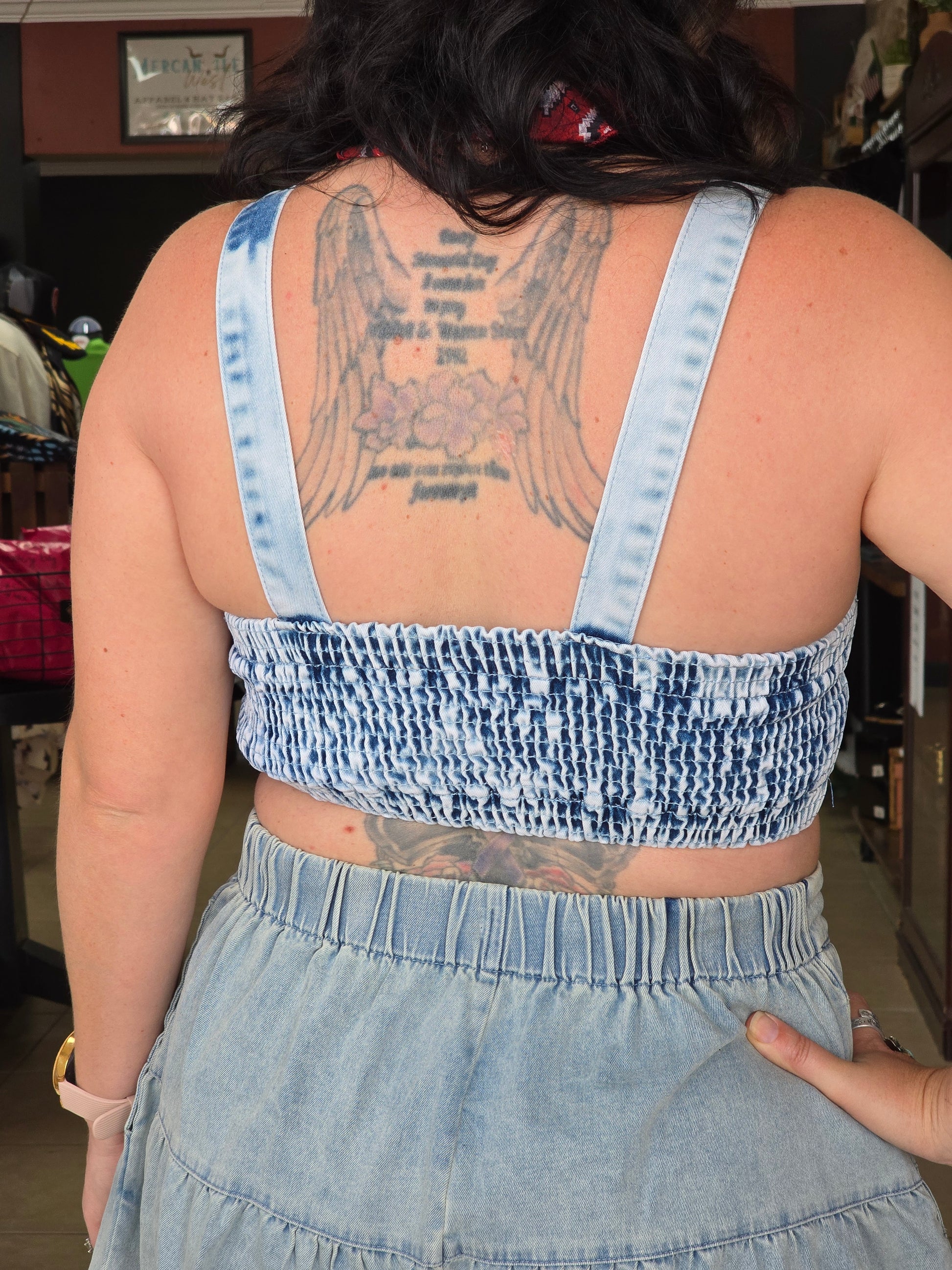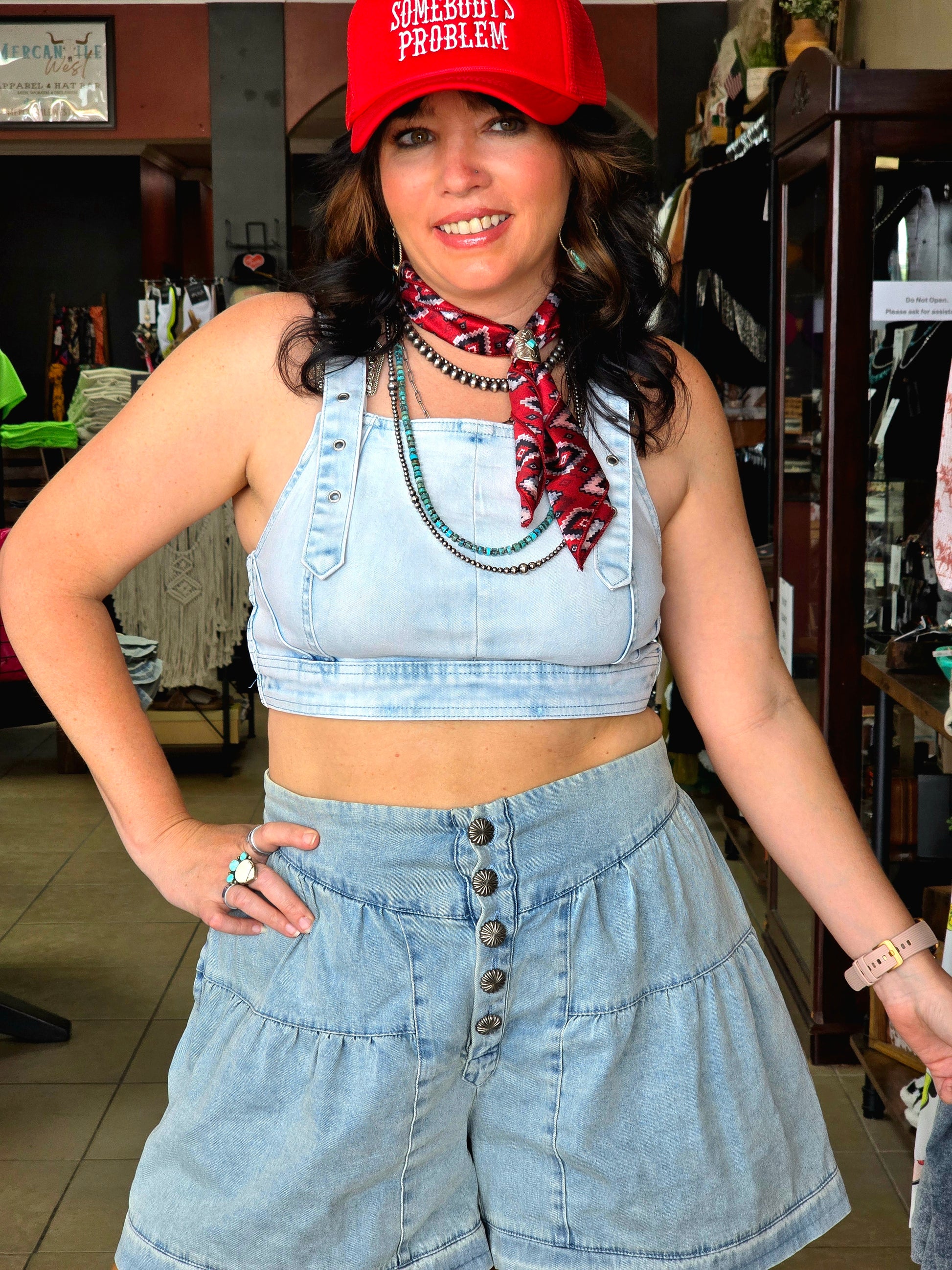The Buckleup Buttercup Top is a versatile denim crop top that's perfect for any season. Featuring adjustable buckles, it can be worn alone for a summer look or layered with a mesh top for a stylish fall outfit. Made with high-quality denim, it's a must-have for any fashion-forward individual.