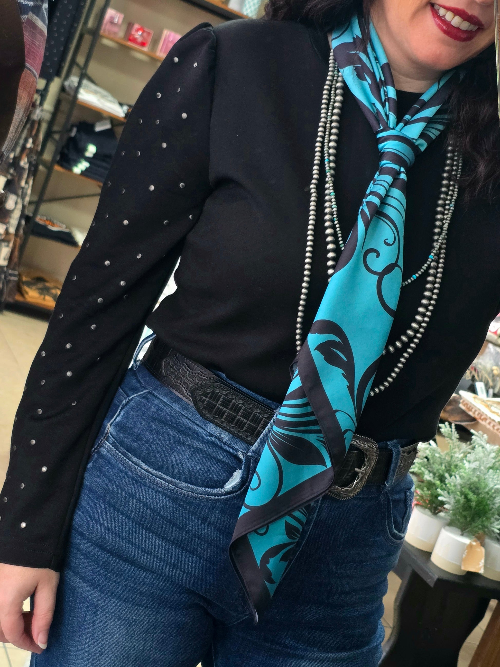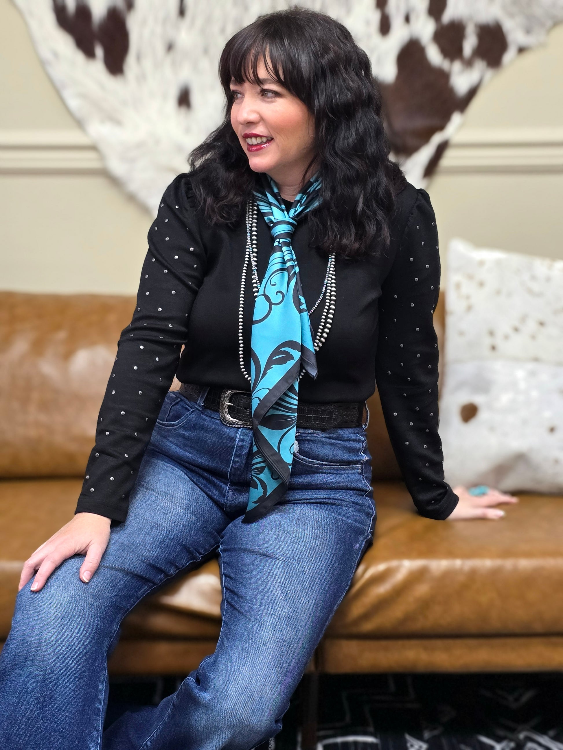The Night Fever Top is a sleek and sophisticated addition to your wardrobe. With a fitted long sleeve design and puff sleeve detailing, this black dressy top exudes elegance. The concho detail adds a touch of Western charm. Rest assured, the true-to-size fit will have you looking and feeling your best.