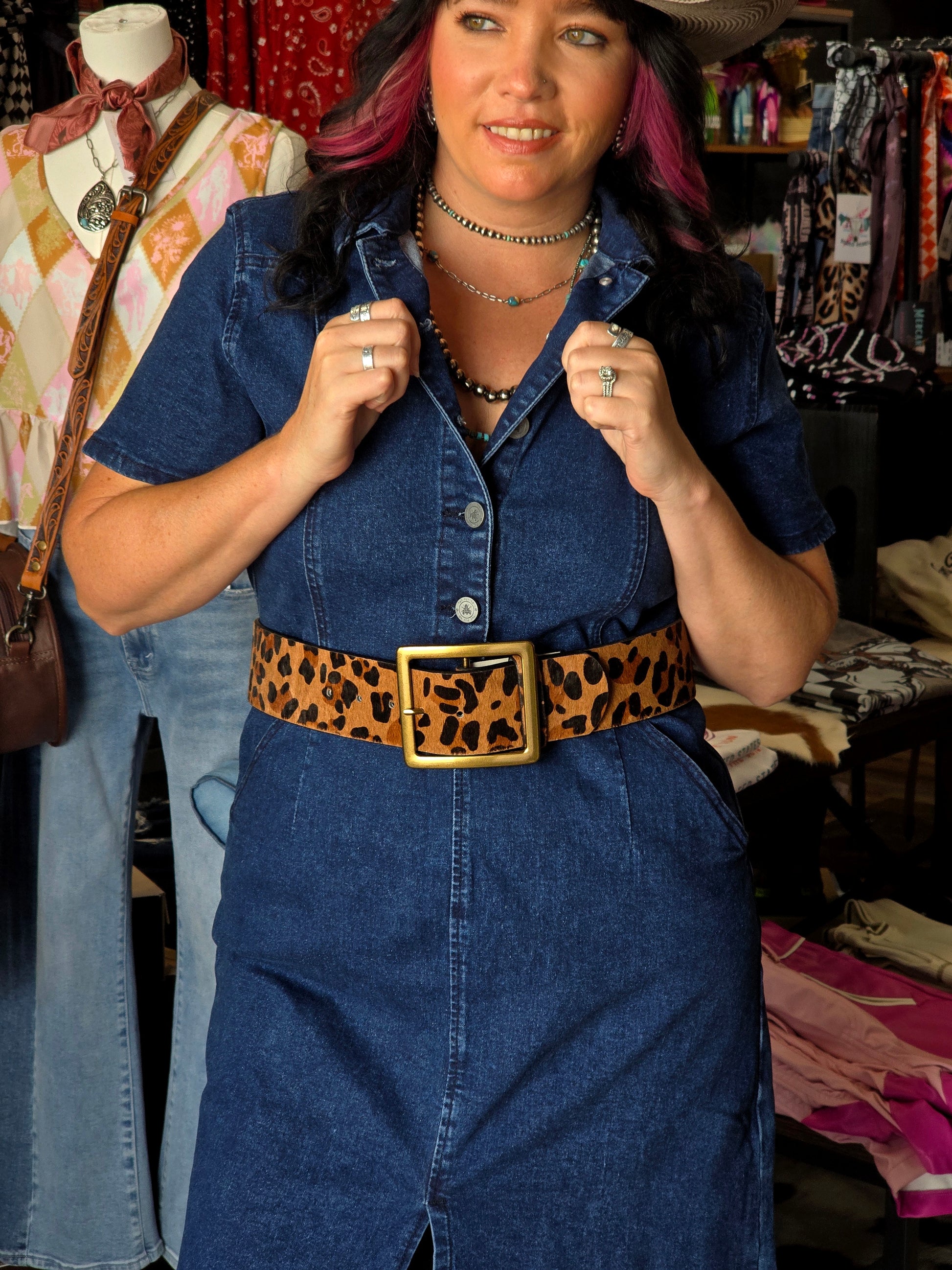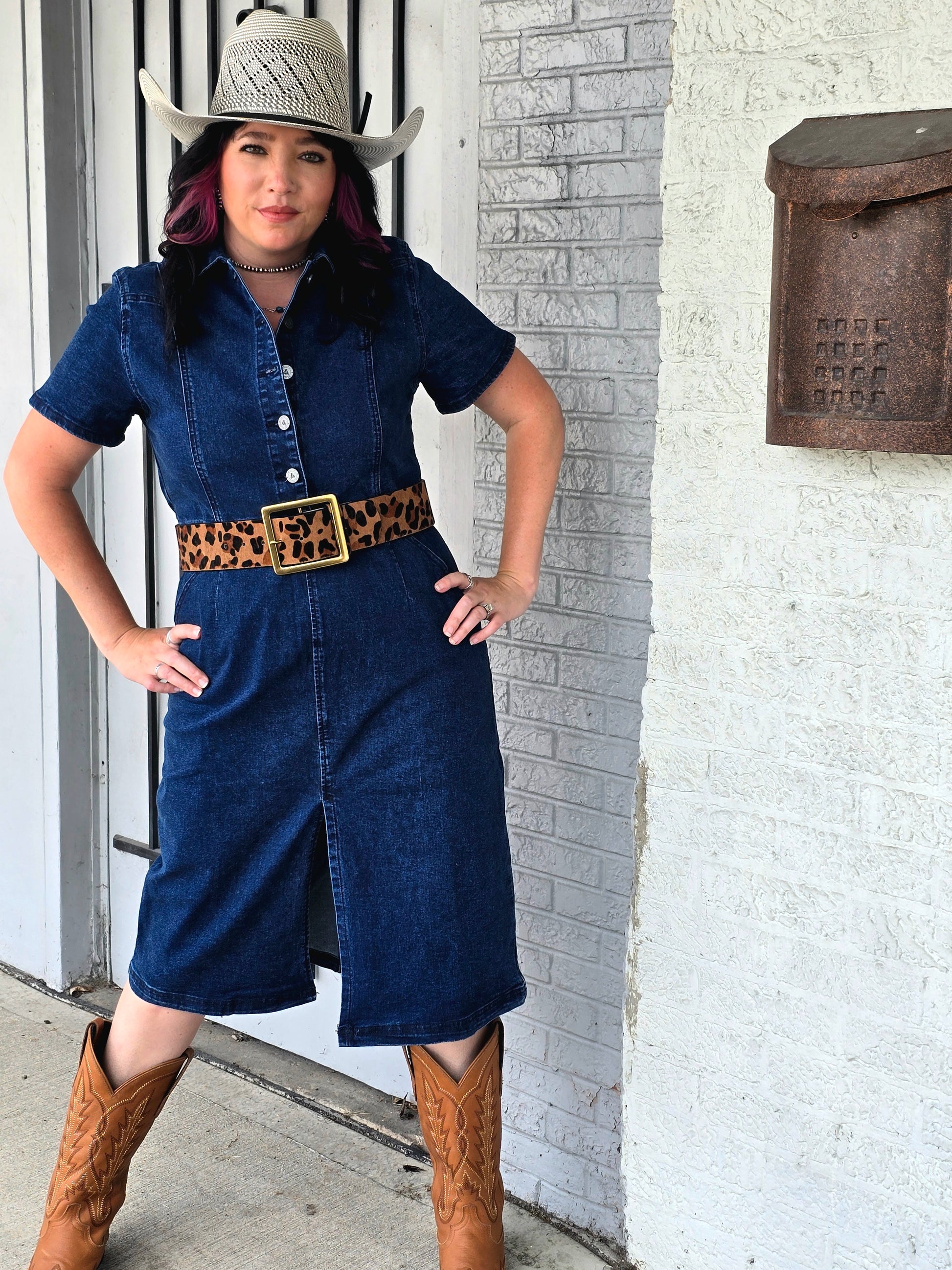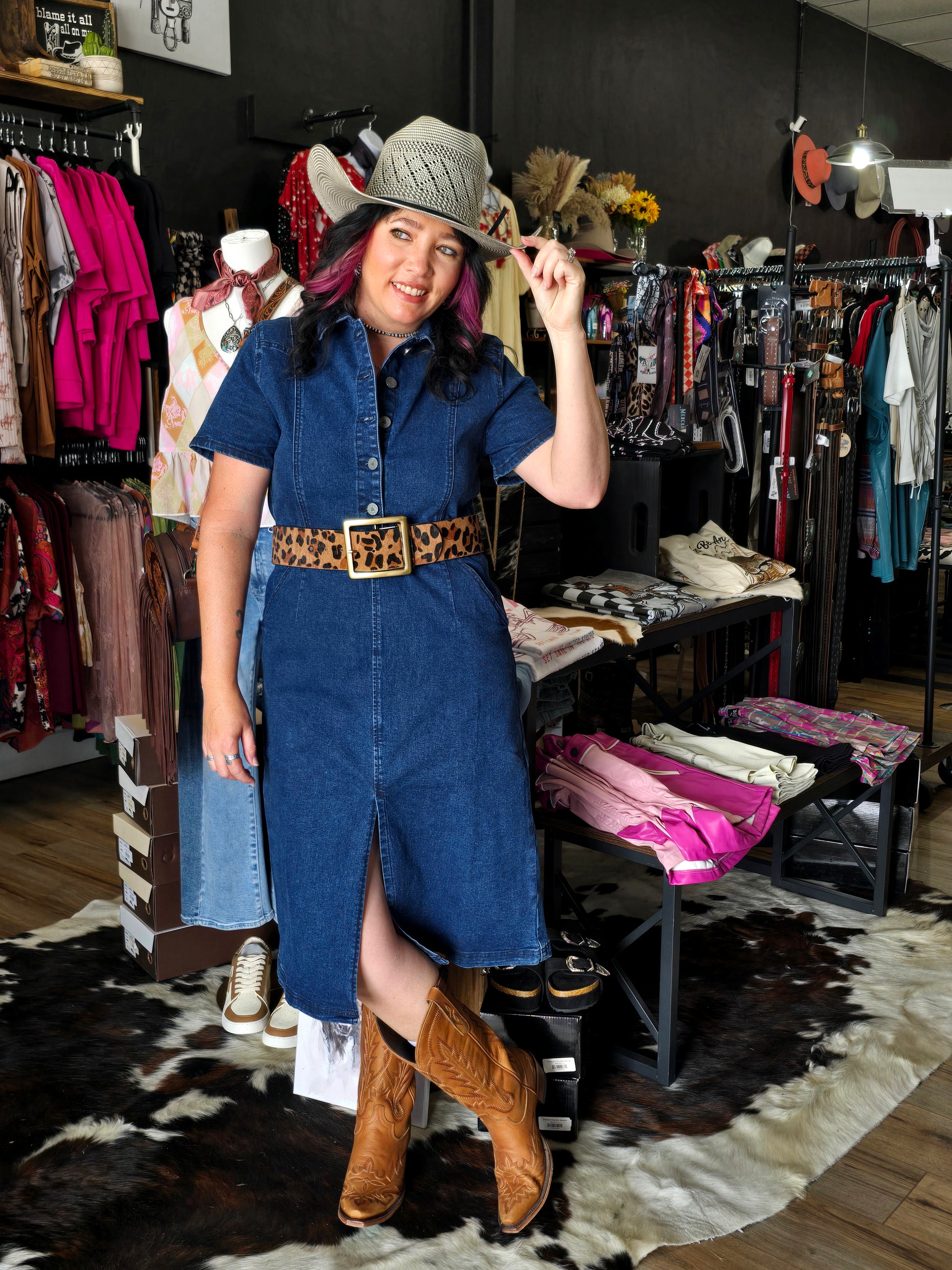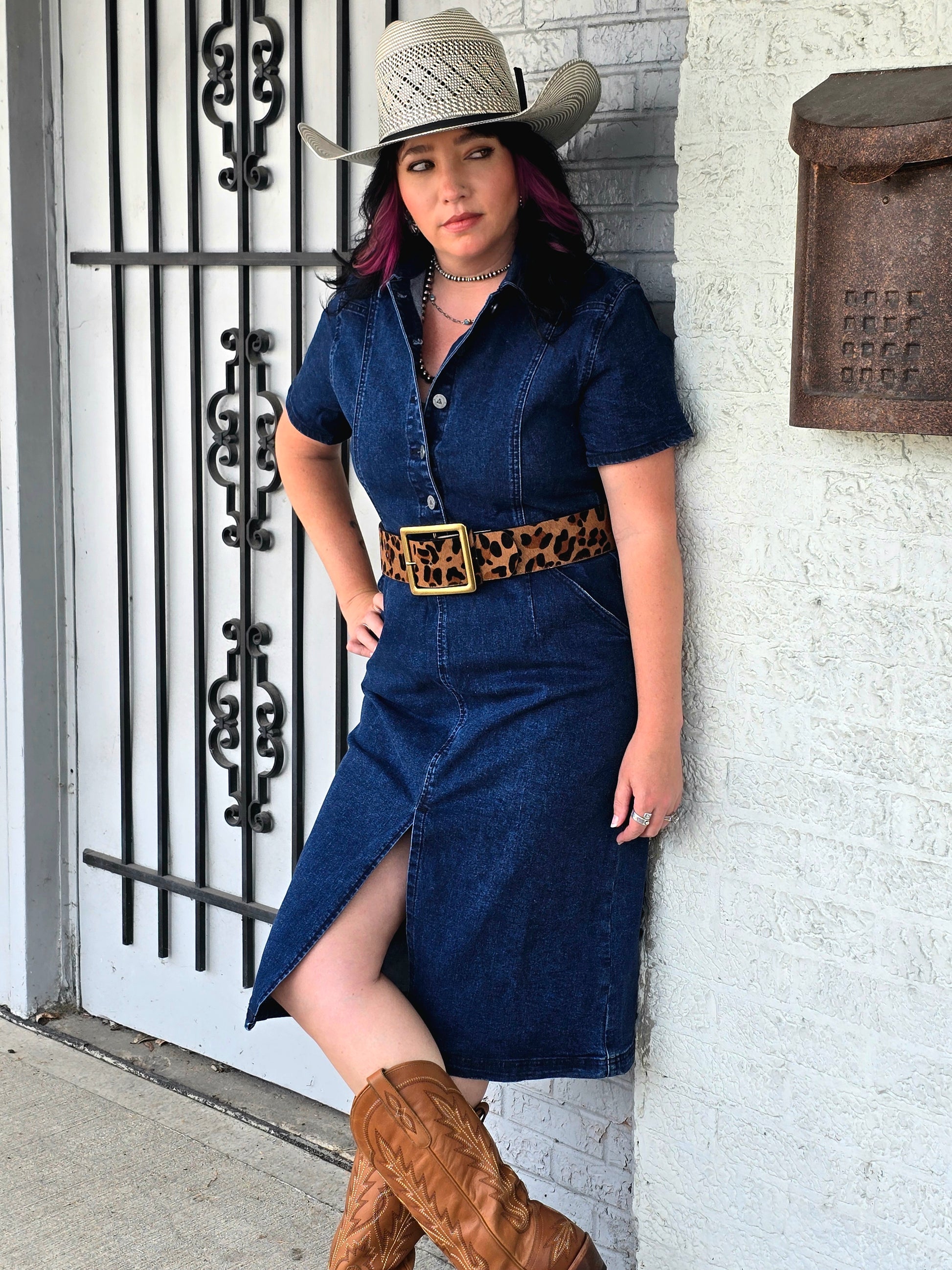 This short sleeve denim dress is a closet staple that will never go out of style. Made from high-quality denim, it is durable and versatile, making it a great addition to any wardrobe. With a timeless design and comfortable fit, this dress is perfect for any occasion.