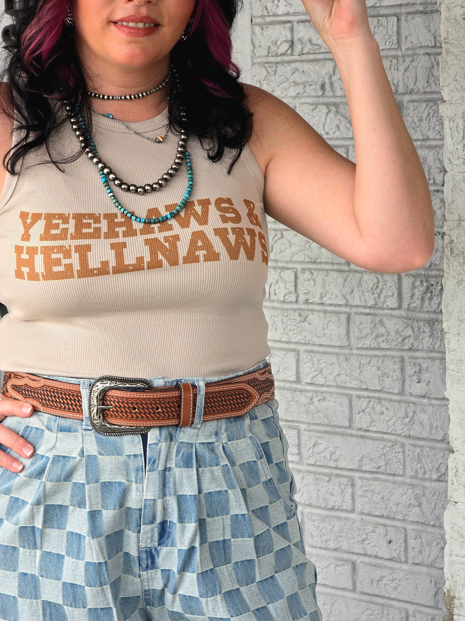 A bold tan tank top with the playful phrase “Yeehaws & Hellnaws ” printed across the front. Made from soft, breathable fabric, this tank combines comfort with attitude. The design features a relaxed fit with wide armholes and a scoop neckline, making it an easy, stylish choice for those who love to stand out and make a statement.