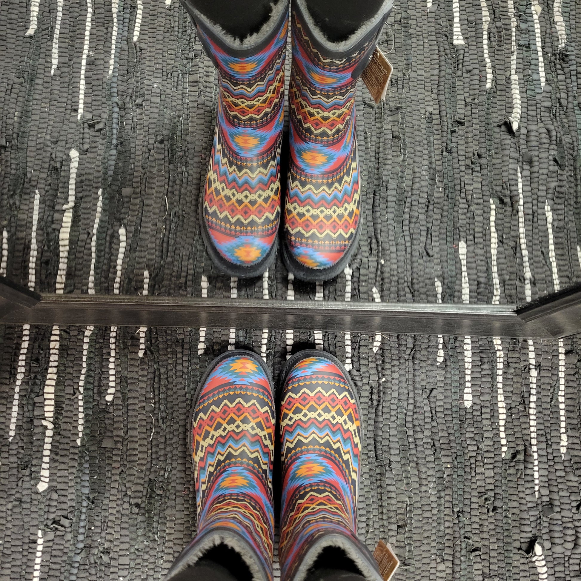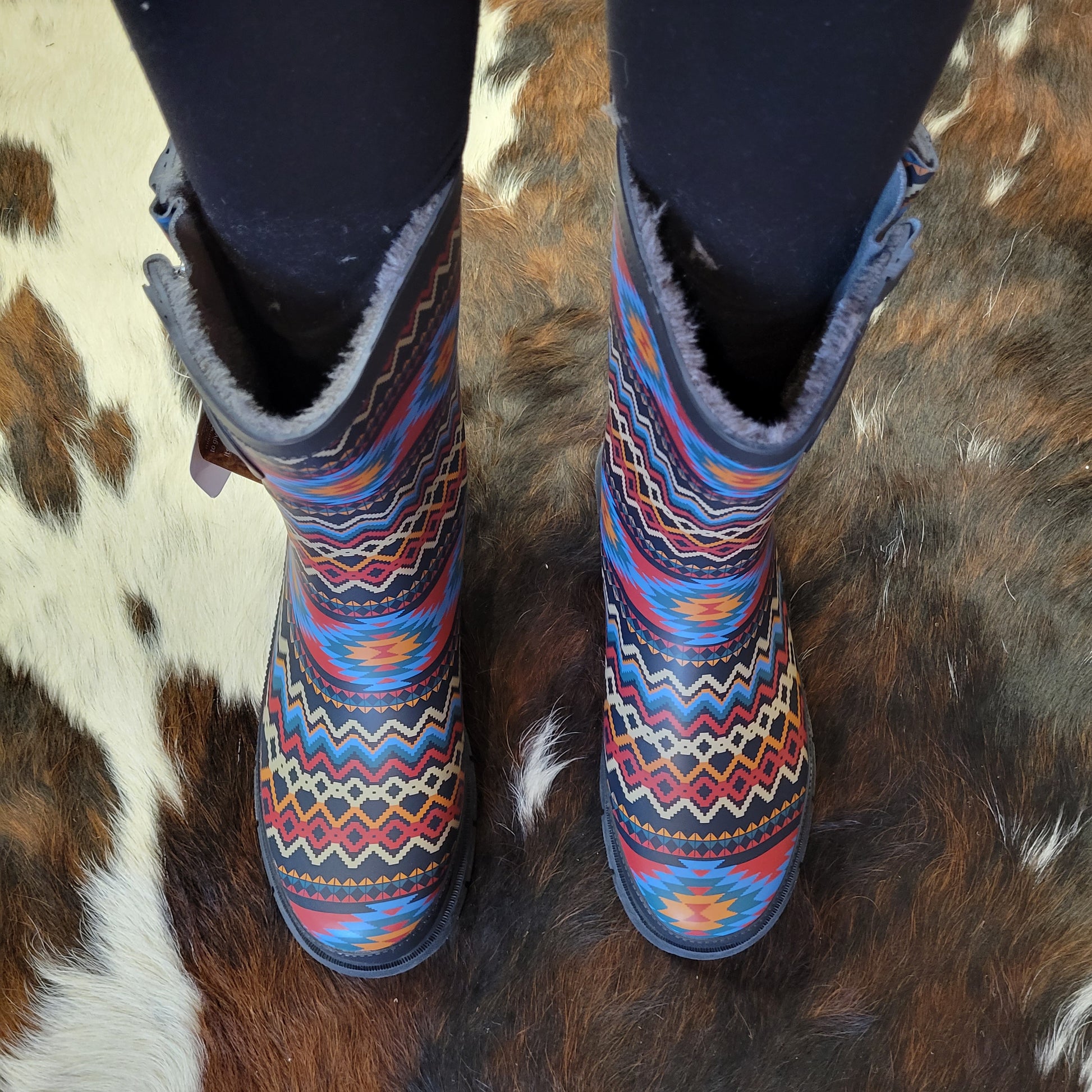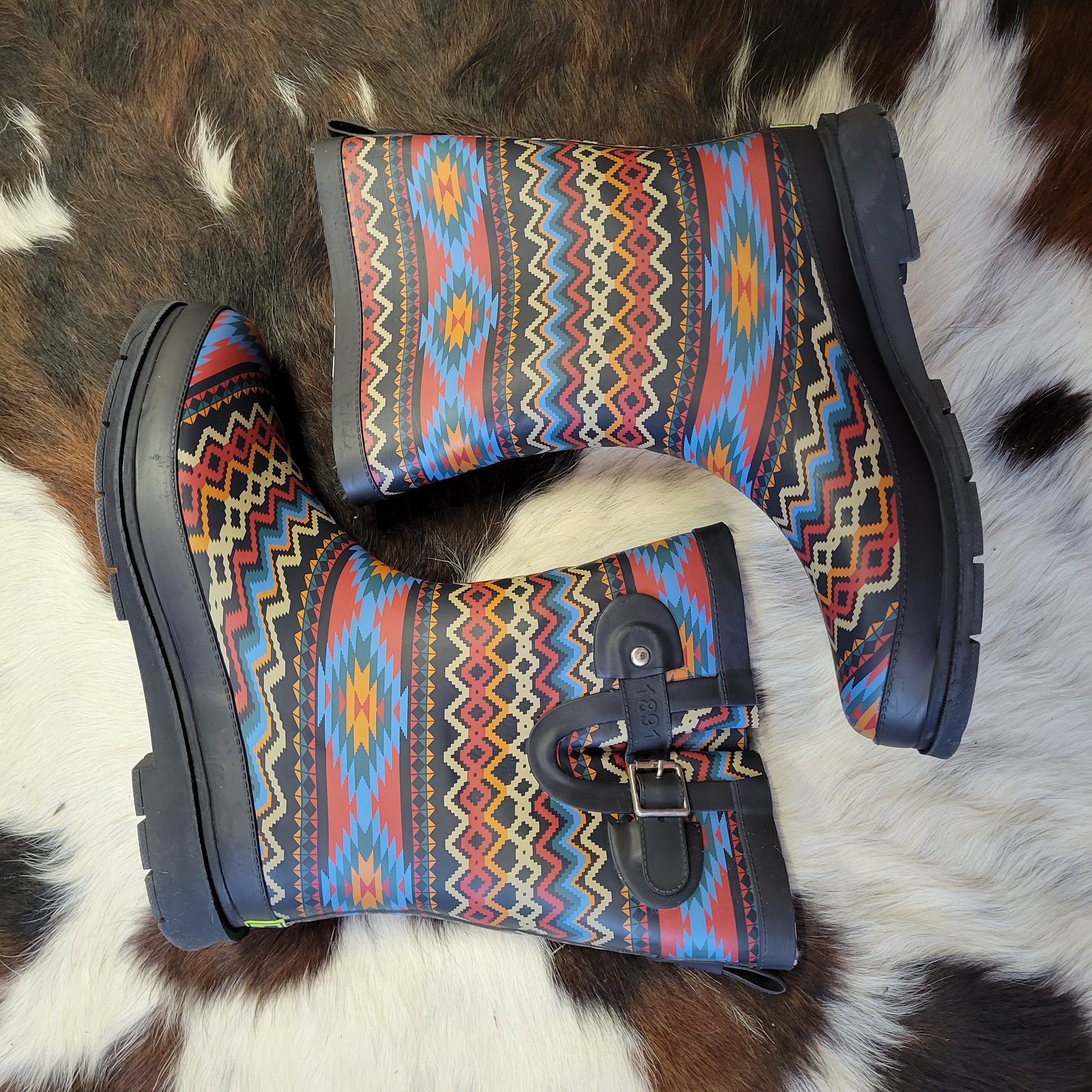 Dark grey boots with a pink, blue, and off-white zig-zag stripe print. Side gusset with adjustable buckle.