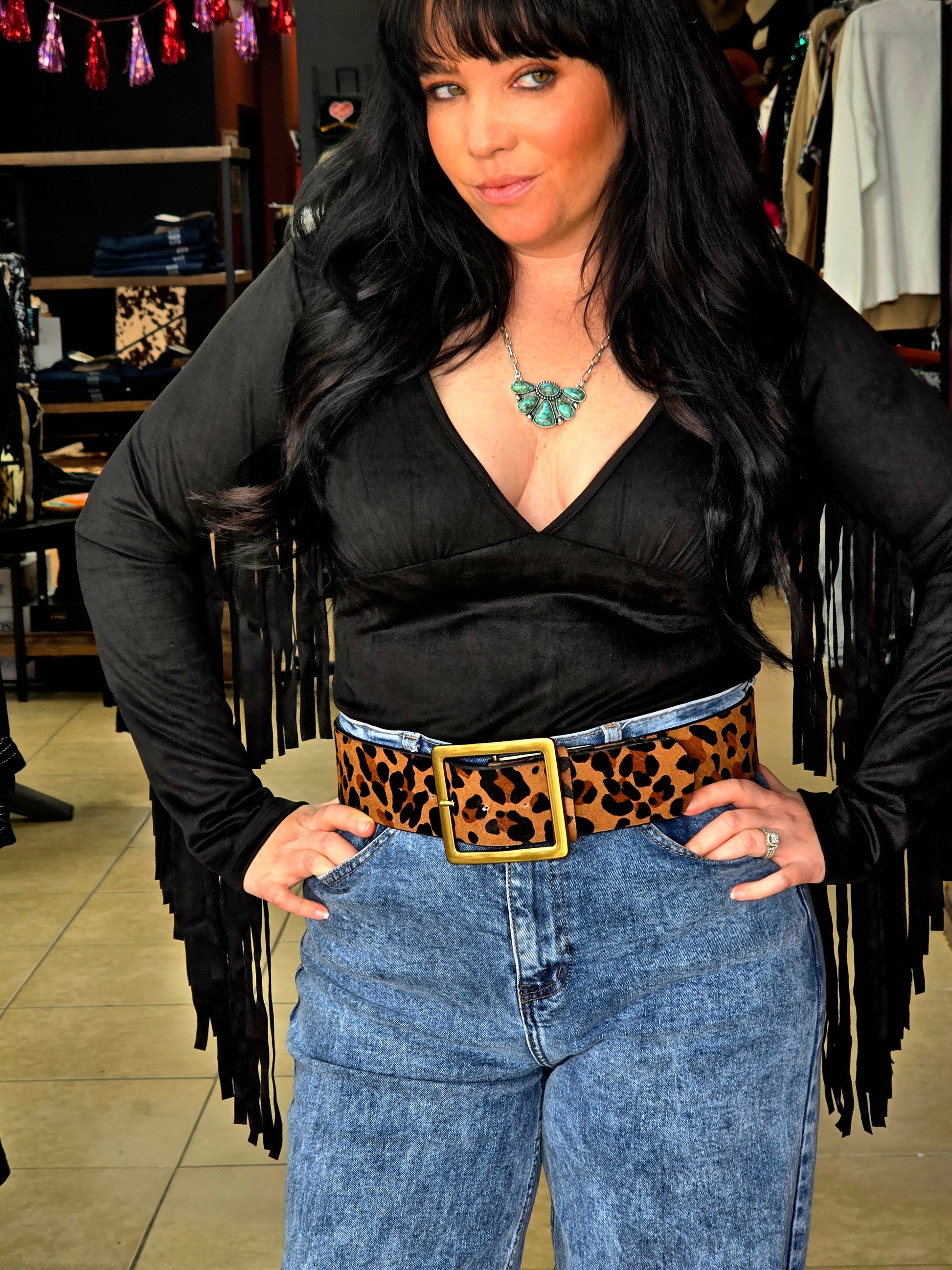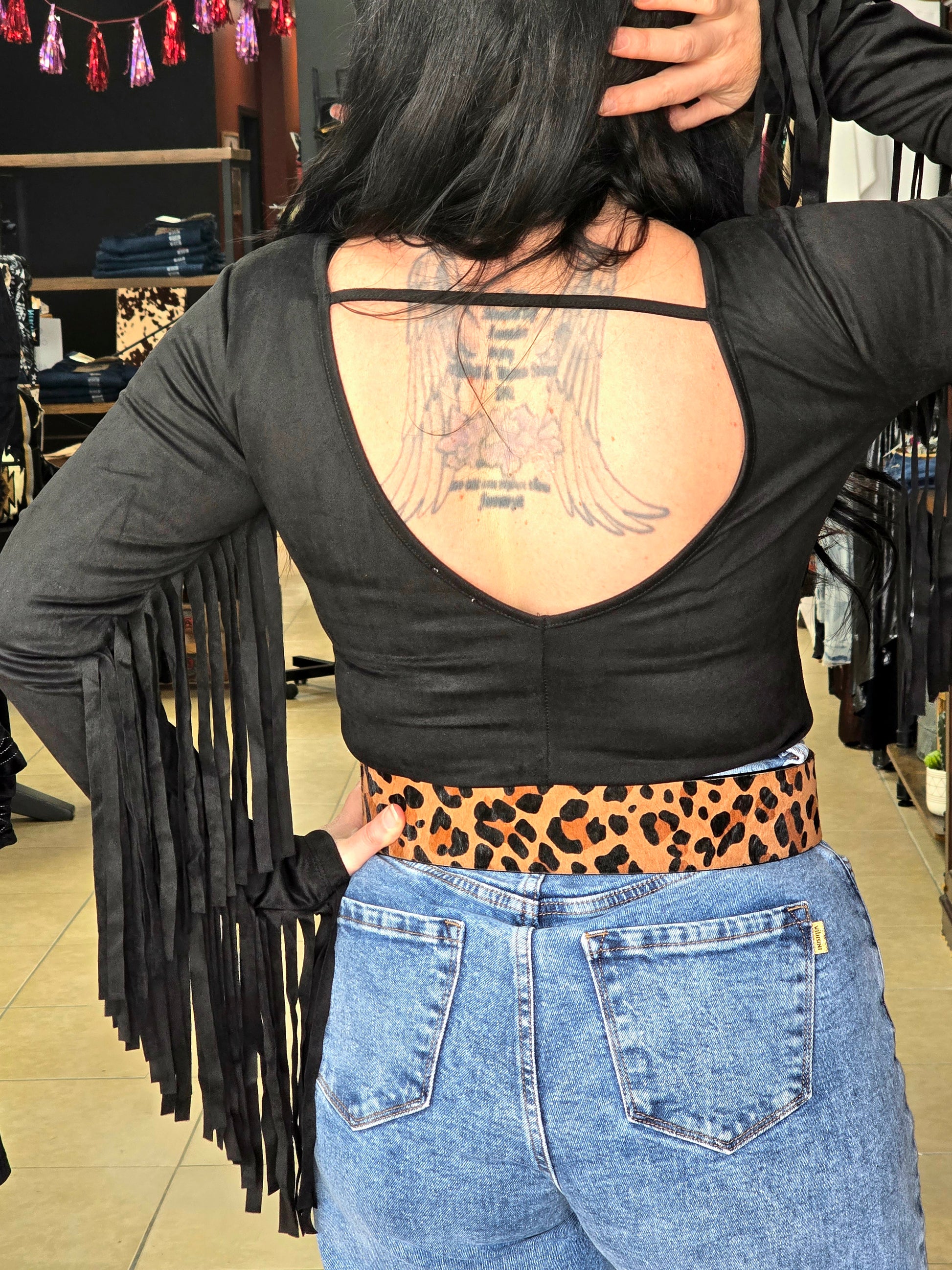 Wrap your every move in style with the MaMa'Cita Fringe Bodysuit. This sleek black bodysuit features playful fringe detailing, giving you the perfect balance of fun and sophistication. Made with high-quality fabric, this bodysuit is comfortable to wear and flattering for multiple body types. Perfect for date nights, concerts, and special events.