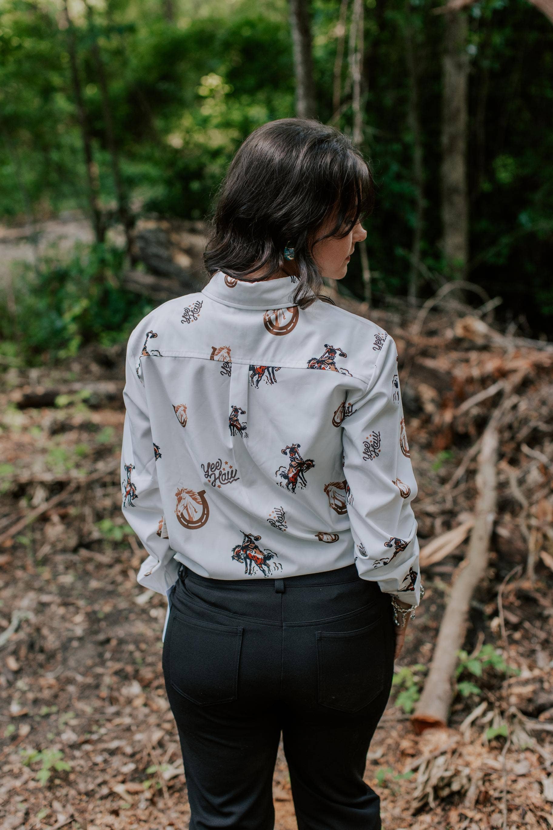 The Yee Haw Pearl Snap Shirt is a classic blouse with a touch of western charm. The pearl snap closure adds a unique detail, while the white color allows for versatile styling. The yee haw and bronc design pattern adds a playful touch to this professional and timeless piece.