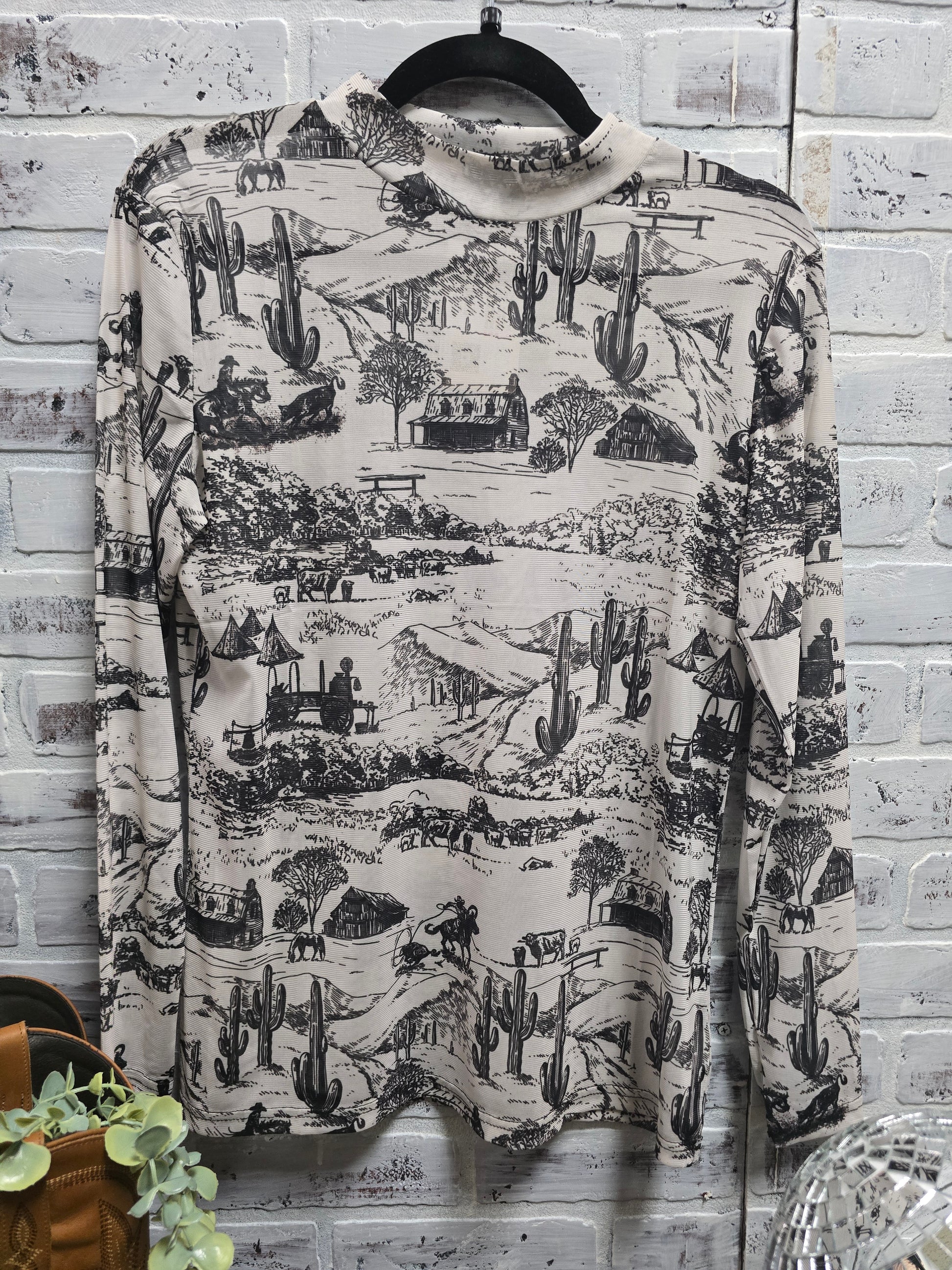 The Old Days Mesh Top features a unique mesh design showcasing a captivating black and white wild west scene. This top allows for maximum breathability while adding a touch of vintage charm to your wardrobe.